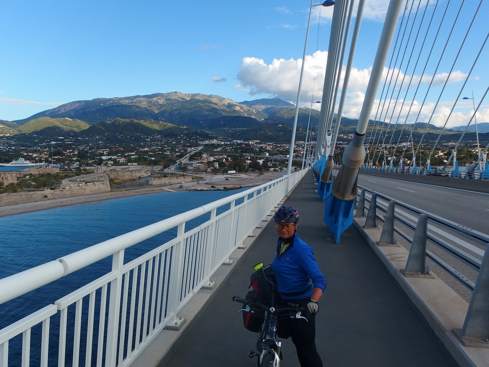 39,5 км (12,5 км) (18-30) - мост через Коринфский залив. Дорожная полиция сгоняет нас с трассы через мост, и мы едем по мосту пошеходной дорожке (рис. 142). пересекаем мост и едем вдоль берега залива (рис. 143).