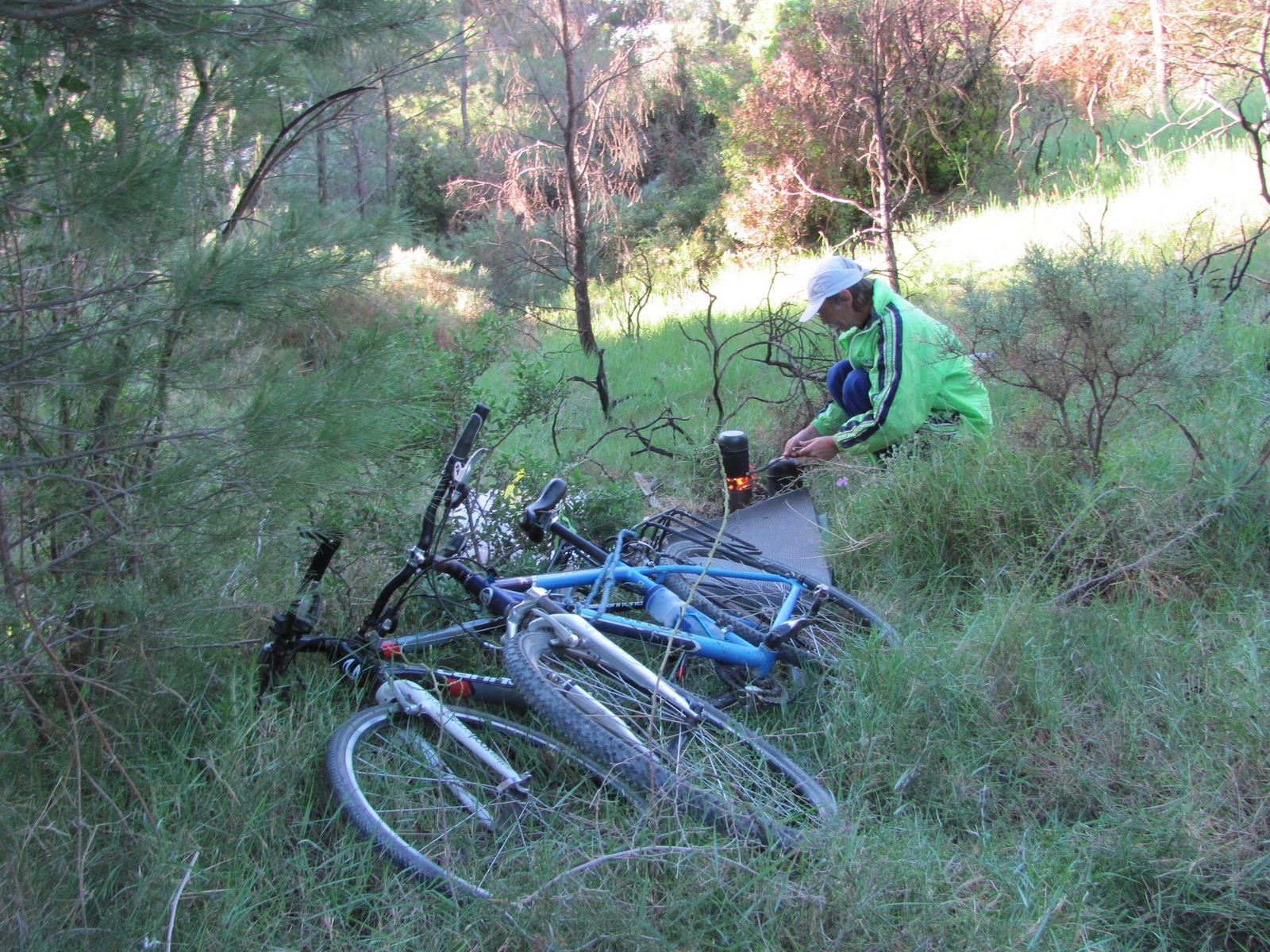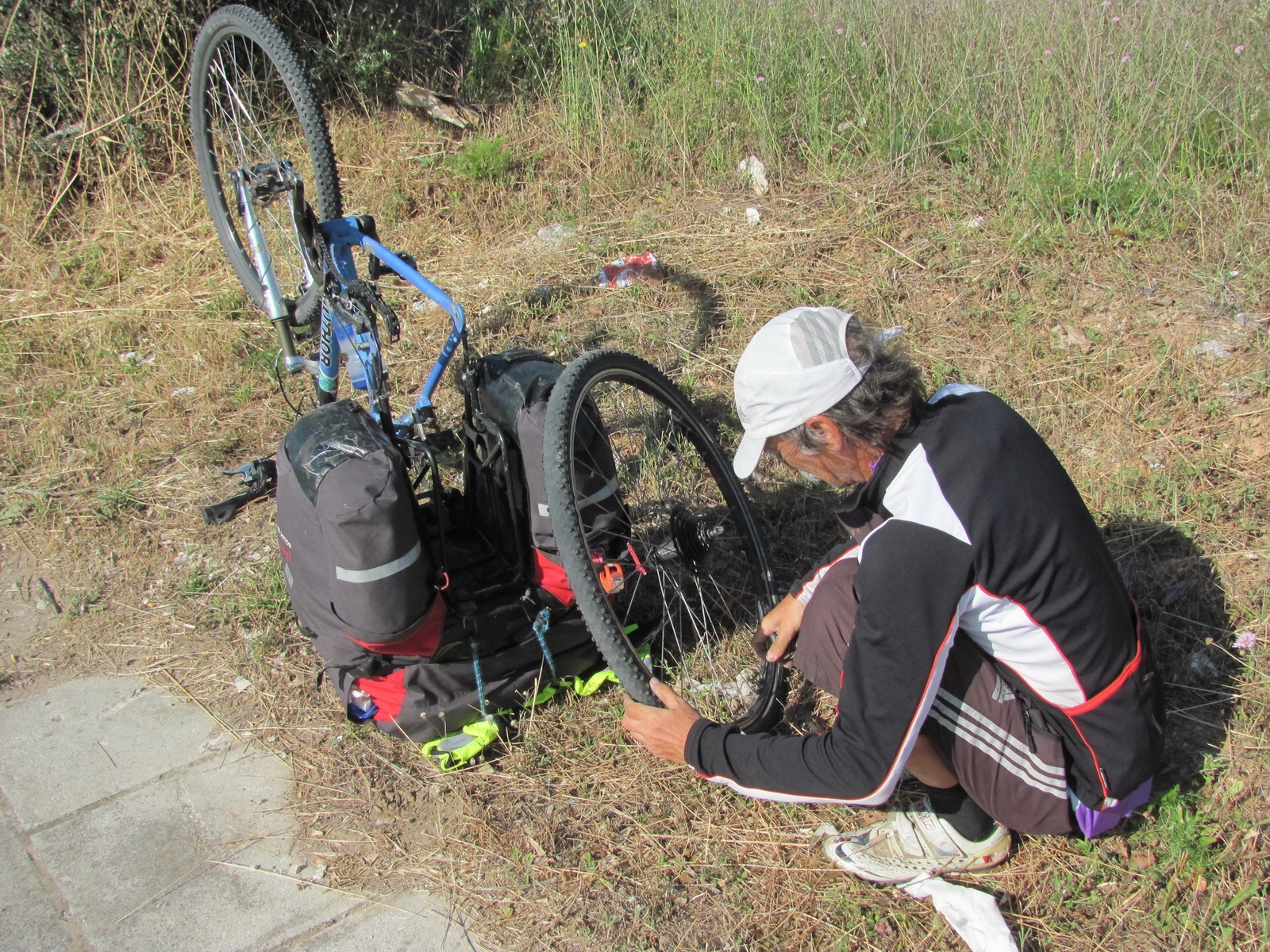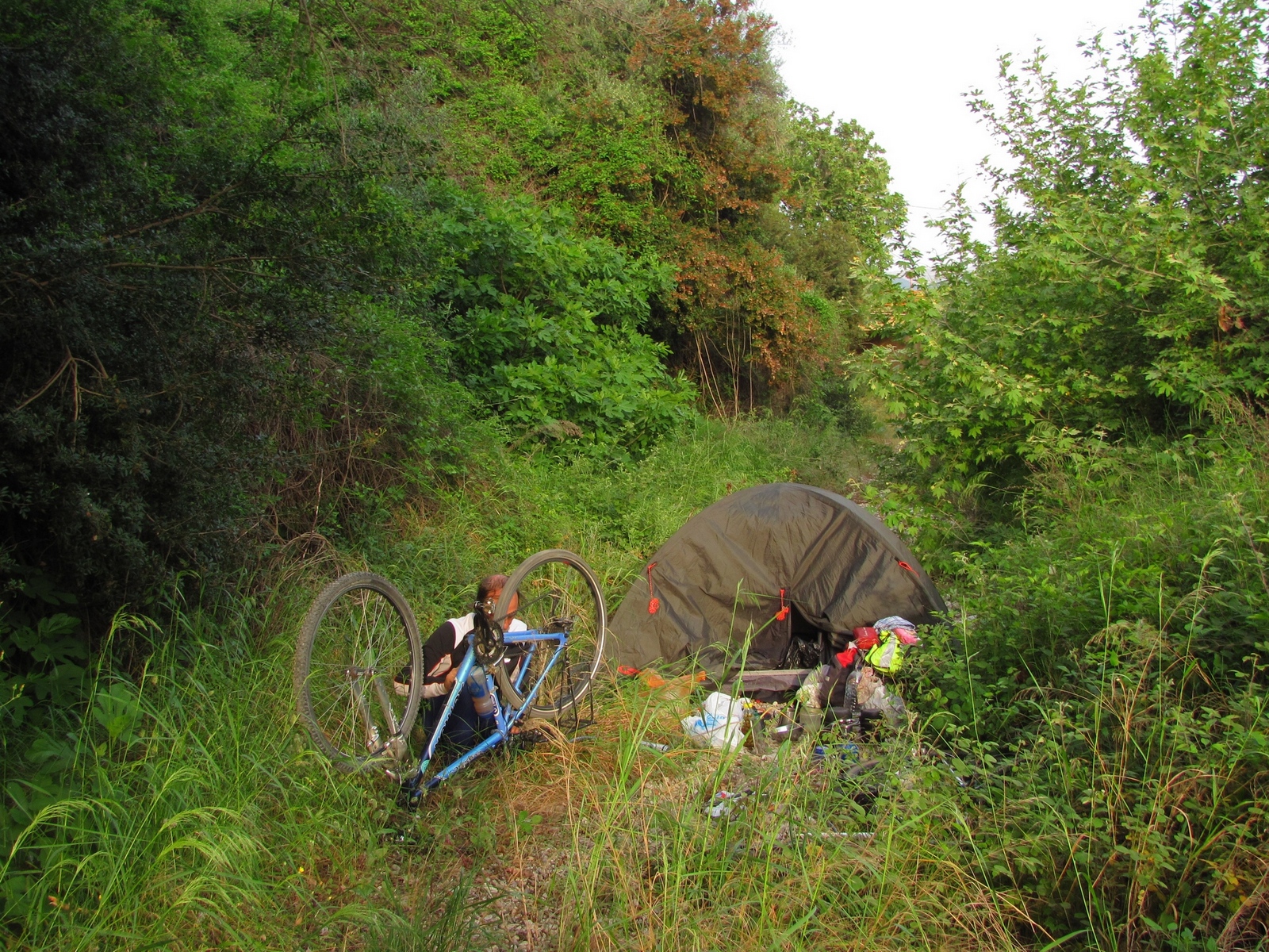0 км (9-20) - выход на маршрут. Место ночевки (рис. 114). Прокол у Алены (рис. 115). Встреча с итальянцами - первые и последние встреченные велотуристы (рис. 116)