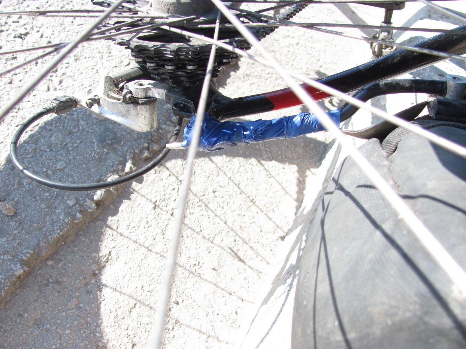0 км (8-30) - выход на маршрут. В гостинице (рис. 183). Поломка багажника (лопнула стойка) у Федора. Хорошо, что в последний день. Для ремонта потребовалась столовая ложка, ботиночный шнурок, изолента - до аэропорта хватило. прокол у Алены (рис. 184).
