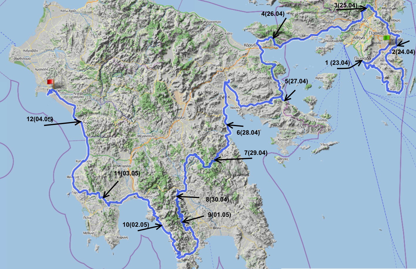 1. Справочные данные.В период с 23 апреля по 9 мая 2016 года группой туристов из г. Одессы в количестве двух человек был совершен поход по полуострову Пелопоннес (Греция). 1.1. Параметры похода Протяженность велосипедной части маршрута, всего – 1135 км