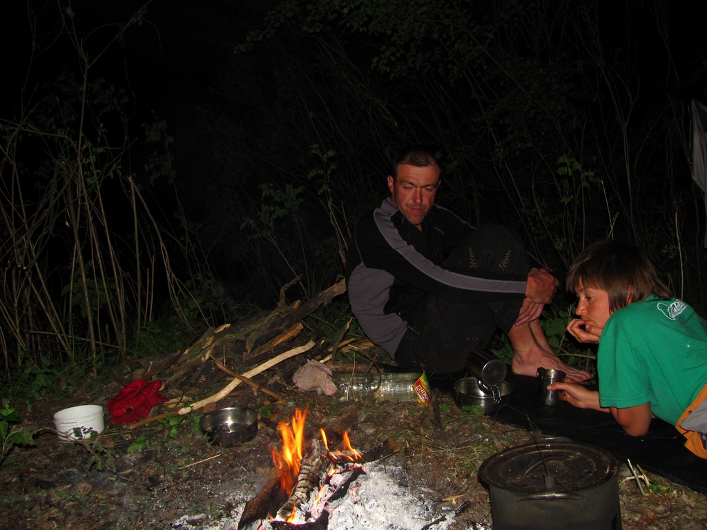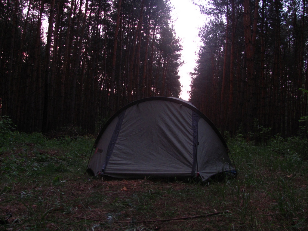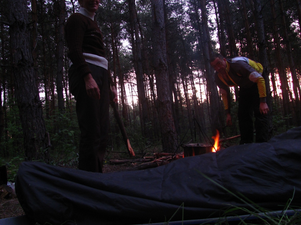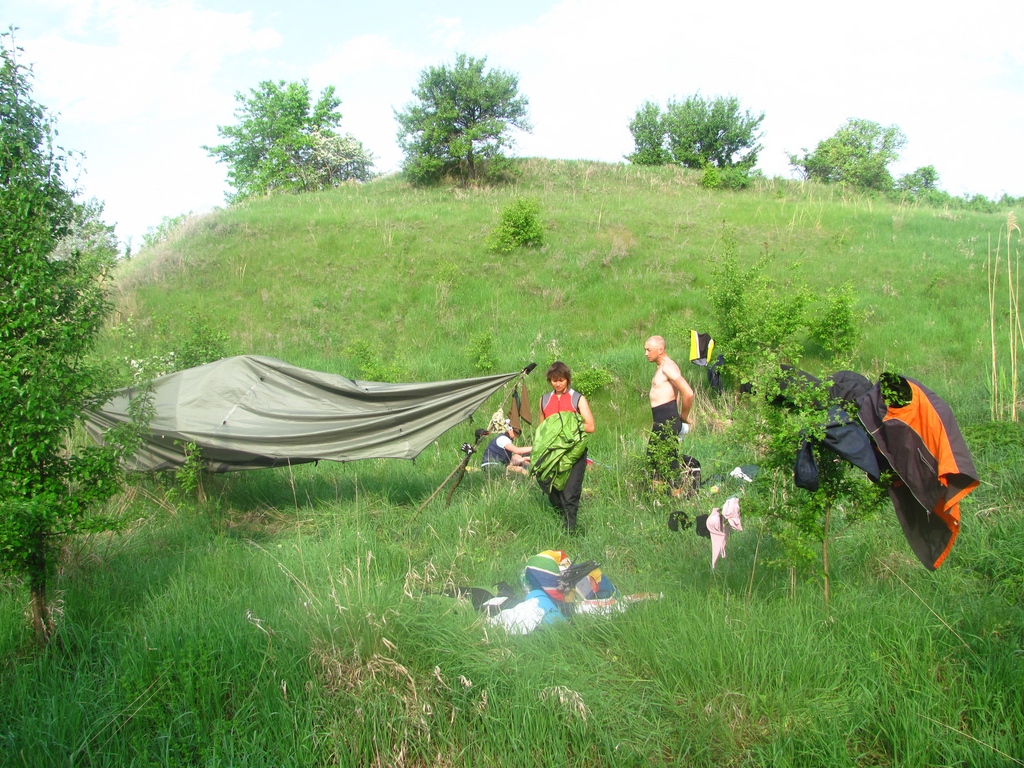 Ставим тент, палатки. Дежурные готовят ужин на горелке. Ужин в палатке. И здоровый сон.