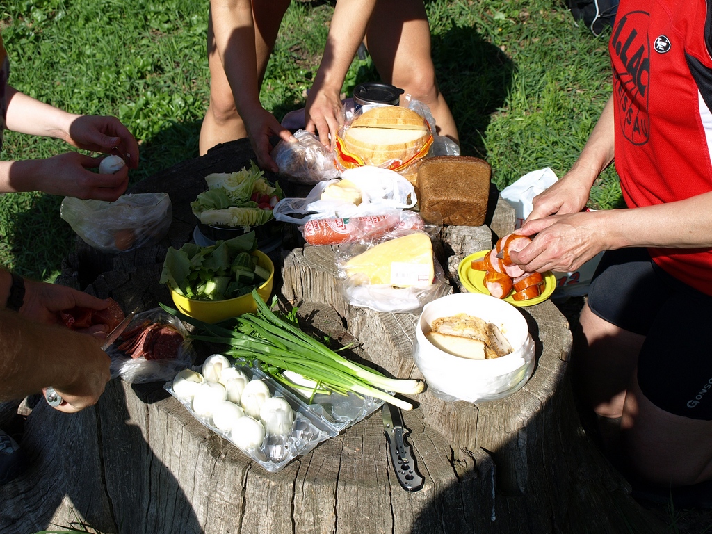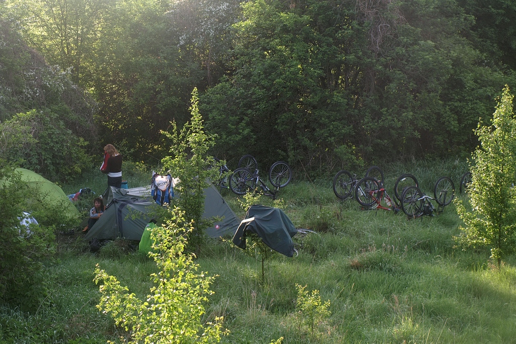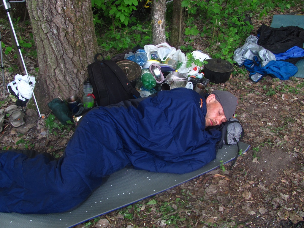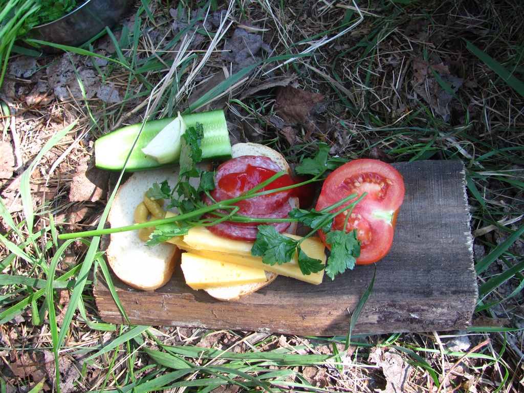Ставим тент, палатки. Дежурные готовят ужин на горелке. Ужин в палатке. И здоровый сон.