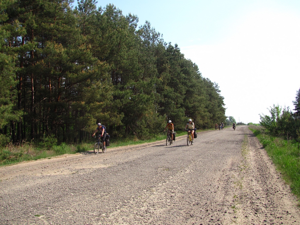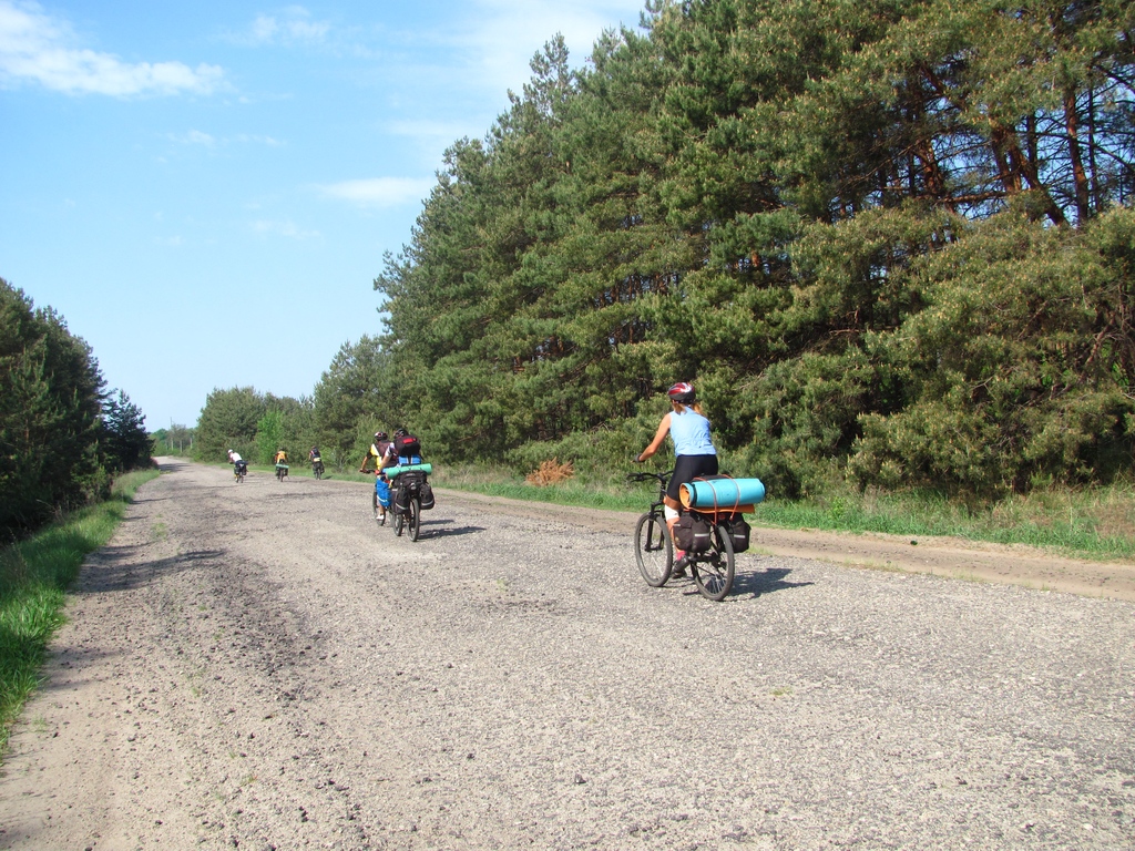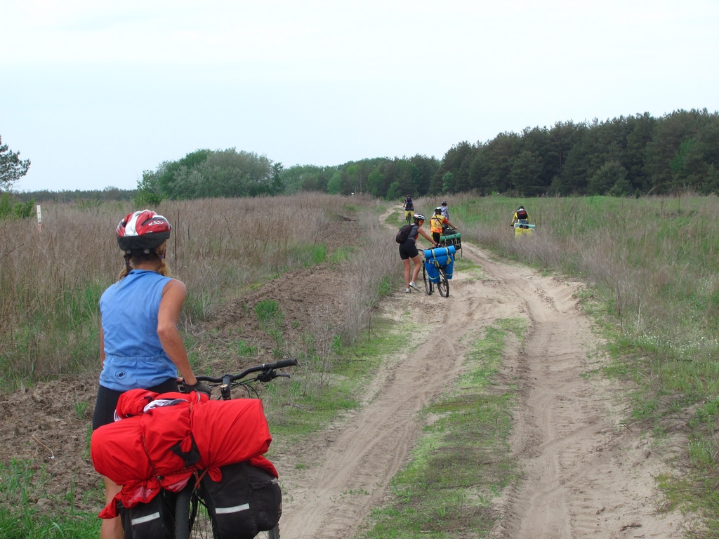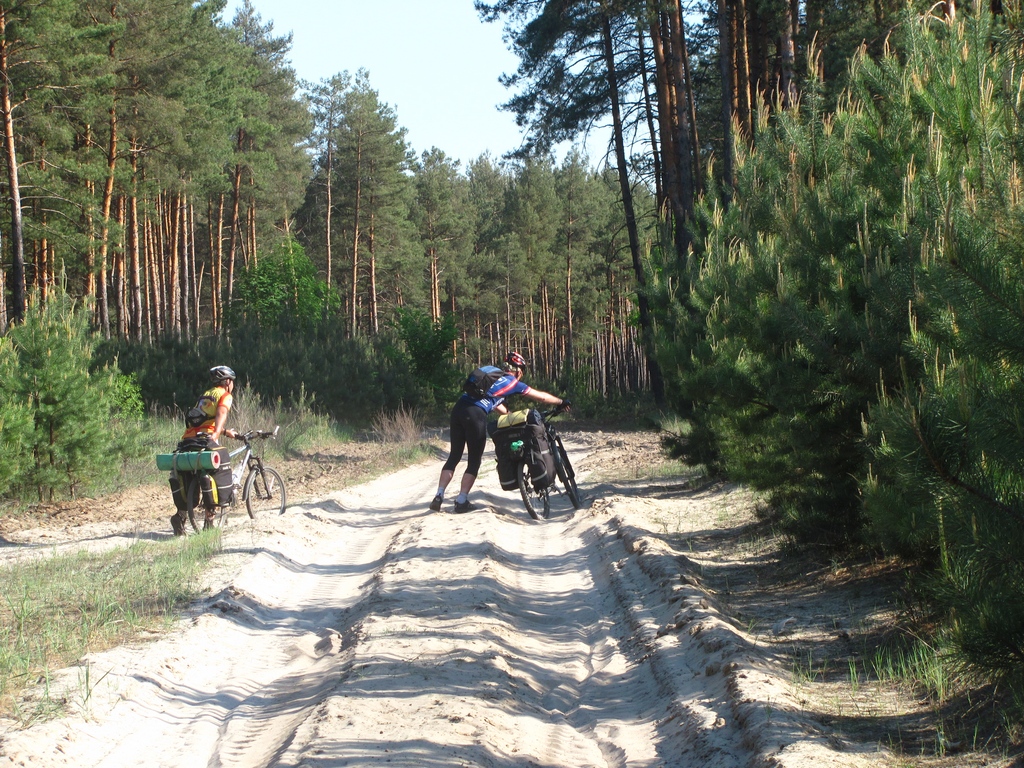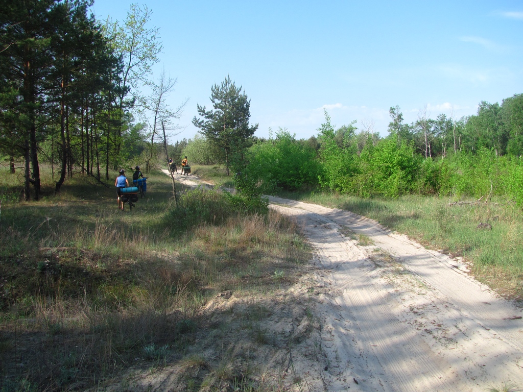 За мостом едем по тропинке, которая постепенно переходит в грунтовую дорогу. Проезжаем Головач. А за железнодорожным переездом начинается песчаная грунтовка, проехать по которой, практически невозможно. Больше идем пешком. Или, когда позволяет сосновый лес, едем рядом с дорогой.