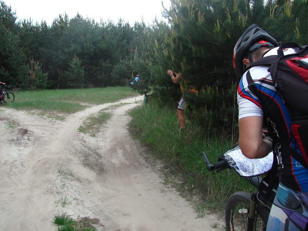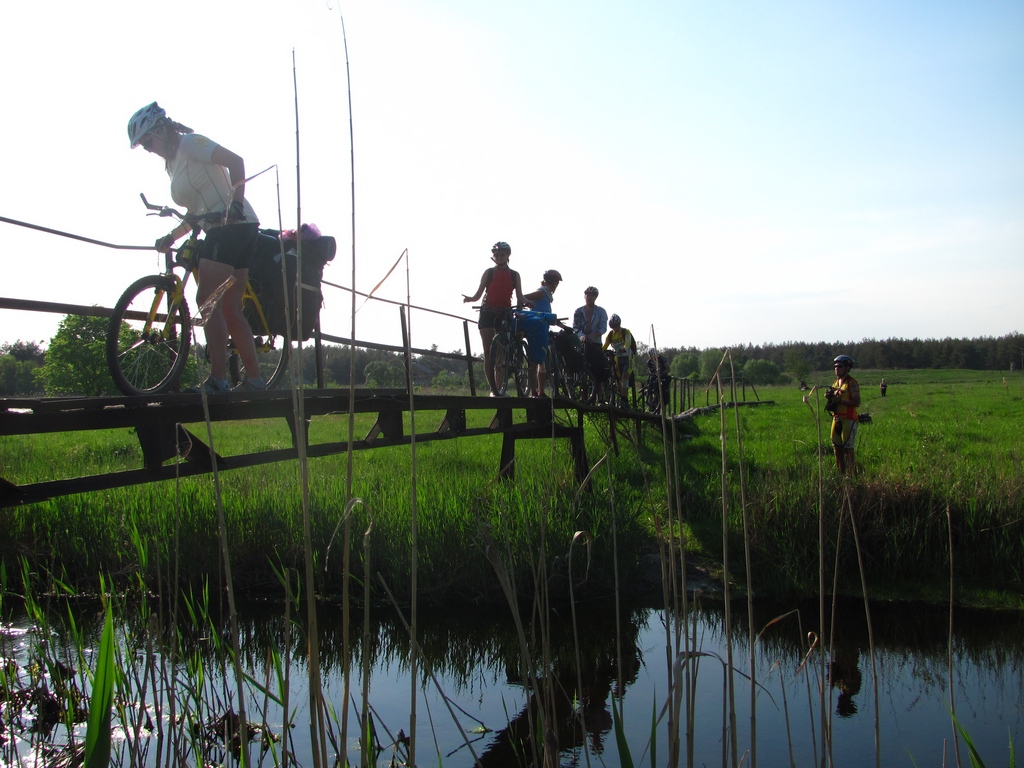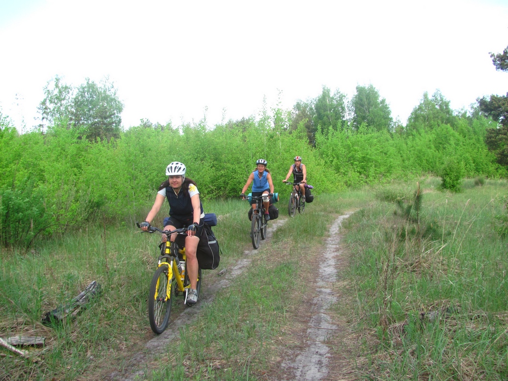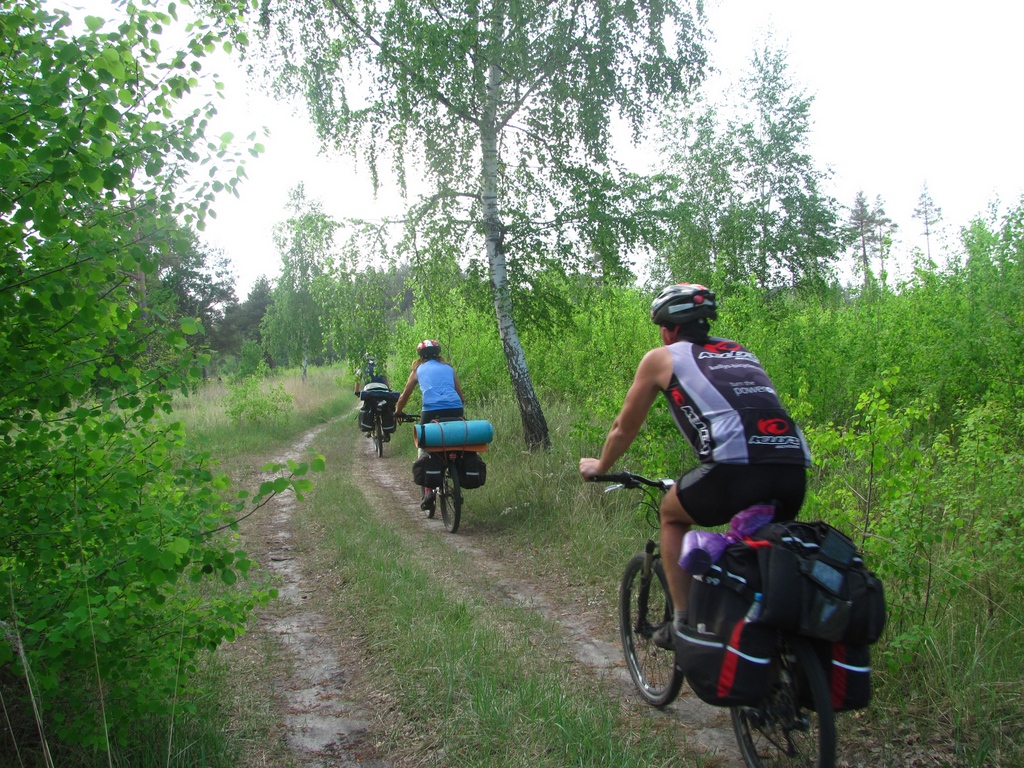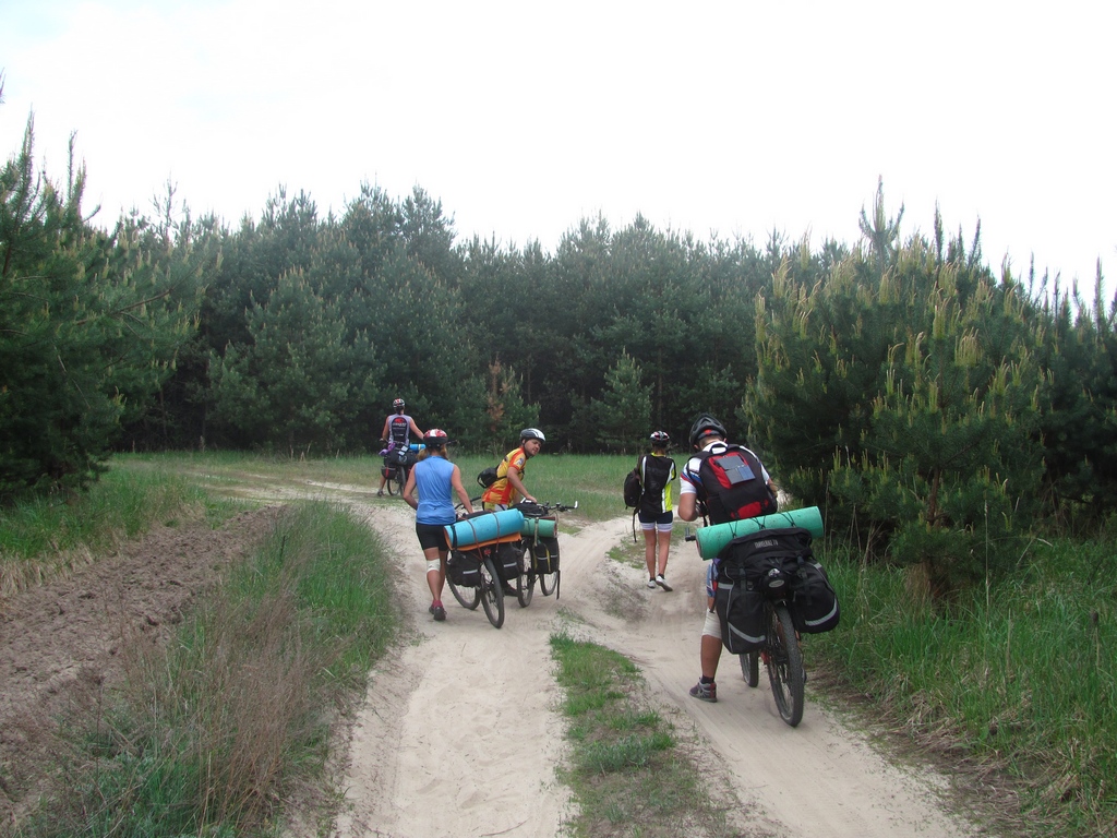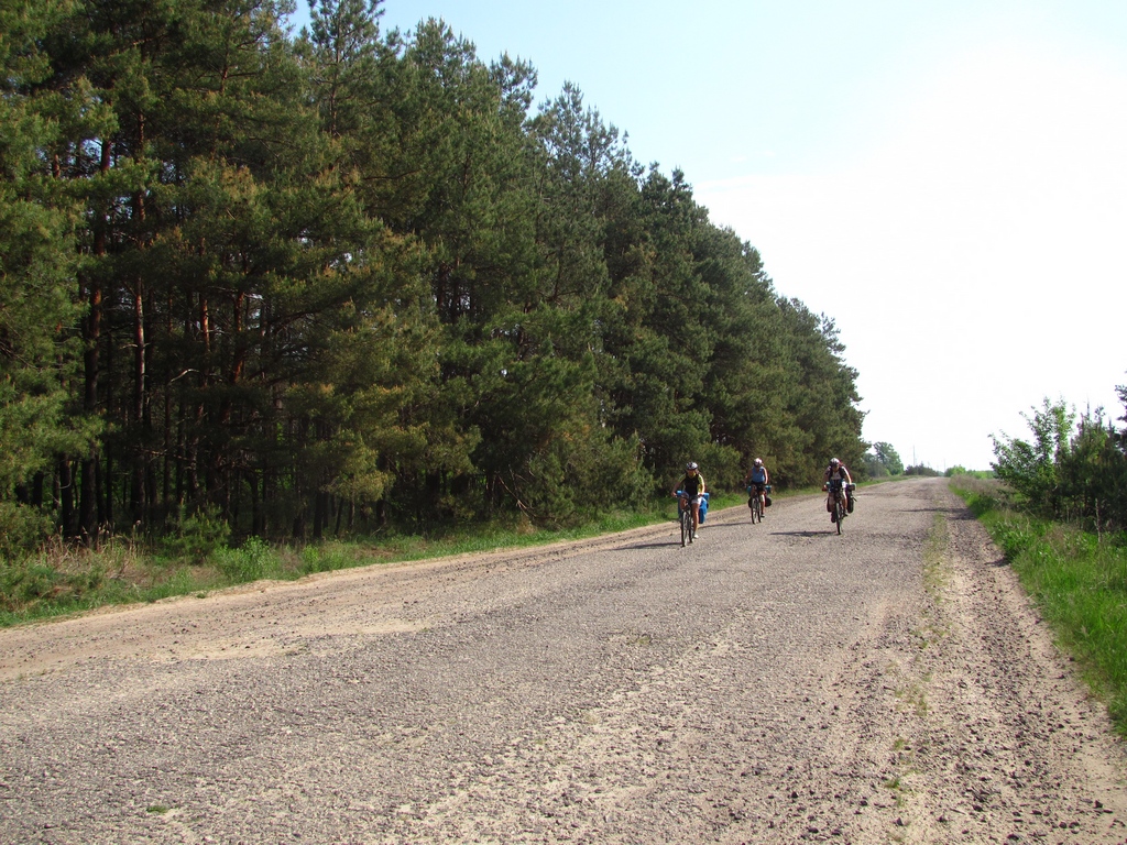 За мостом едем по тропинке, которая постепенно переходит в грунтовую дорогу. Проезжаем Головач. А за железнодорожным переездом начинается песчаная грунтовка, проехать по которой, практически невозможно. Больше идем пешком. Или, когда позволяет сосновый лес, едем рядом с дорогой.