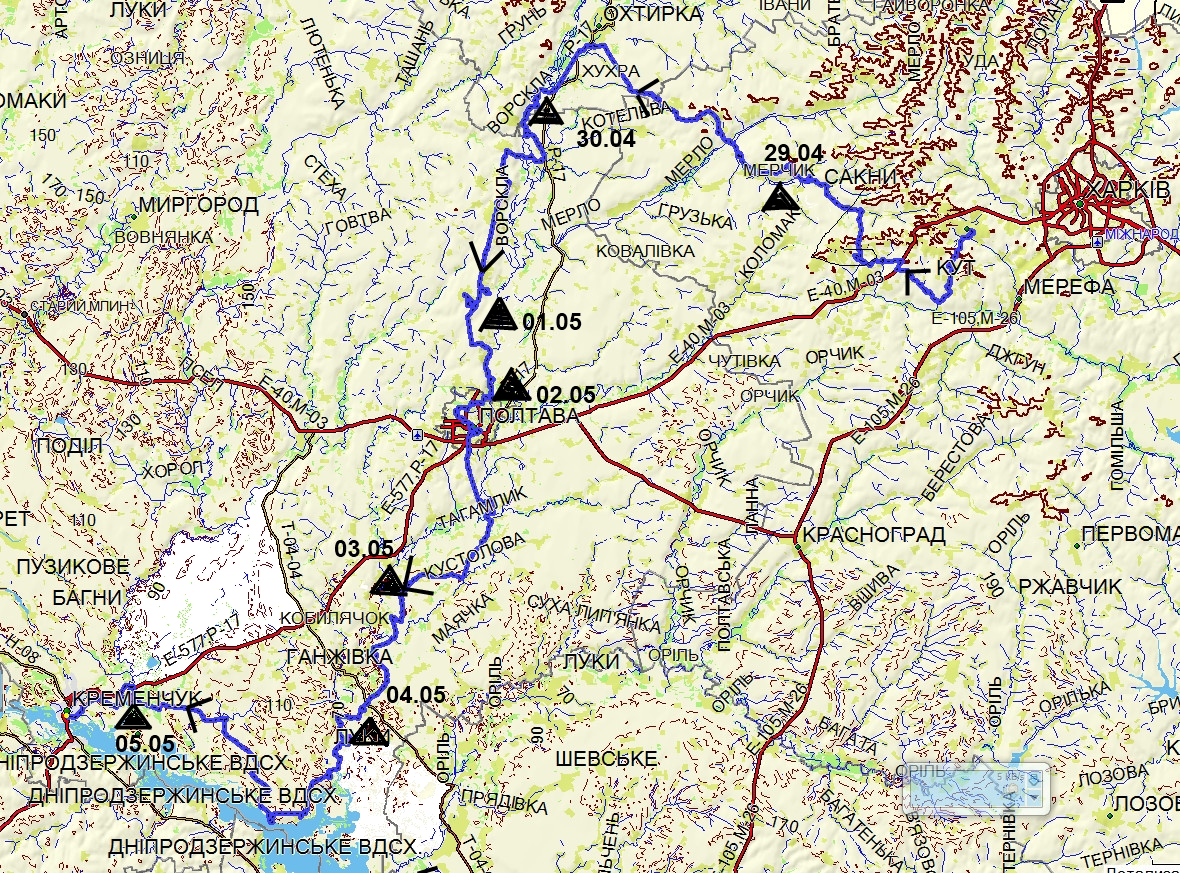 10-30 - выходим на маршрут. Возвращаемся в Дмитровку. Выезжаем на трассу Полтава-Кременчуг. Пересекаем мост через Псел