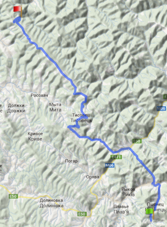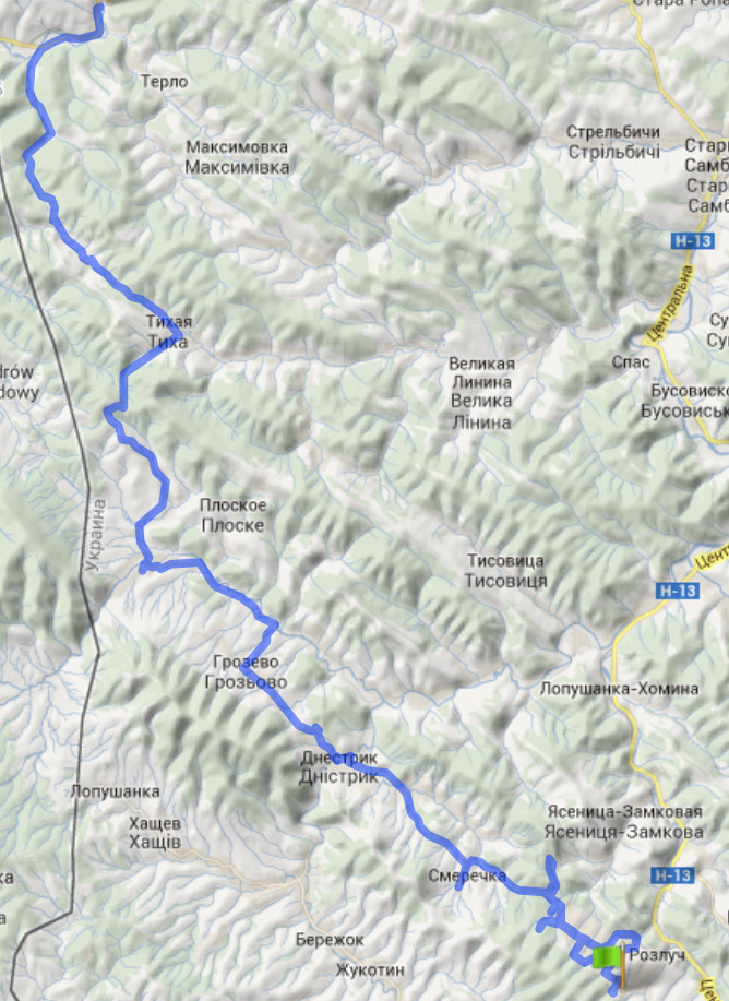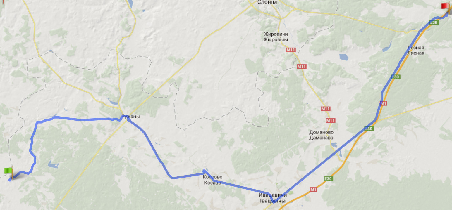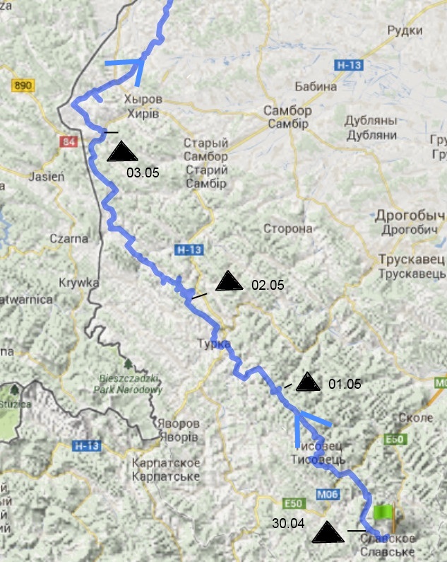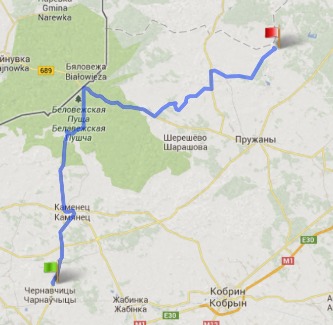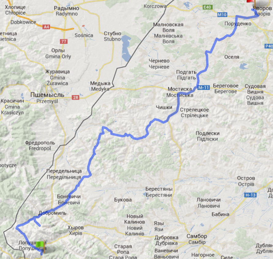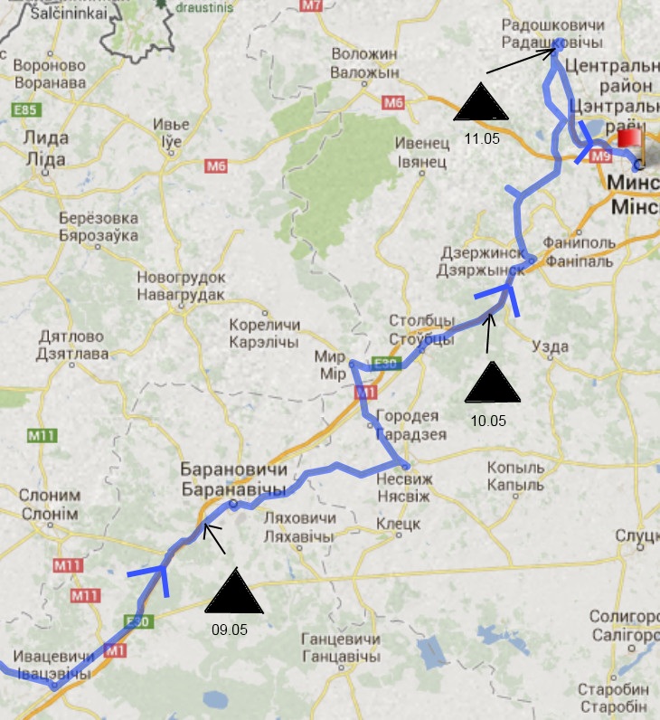 Славское (Украина) Орявчик - Турка – Грязево – Лопушница – Мостиска – Яворов – Коты – оз.Новое – Немиров – Зеленая Гута – Рава Русская  - Заставное  - Заболотье – Варяж – Угринов – Тудорковичи – Нововолынск – Устипуг – Высоцк – Бережцы – Старовойтово – Гуща – Адамчуки – Пульно – оз. Пуленецкое  - оз. Песочное – Пища – (Беларуссия) оз . Олтужское – Ланское – Тересполь –    Брест – Камянец – Каменюки – Беловежская пуща – Пружаны – Барановичи – Несвиж – Мир - Радошковичи -  Минск