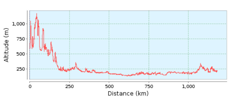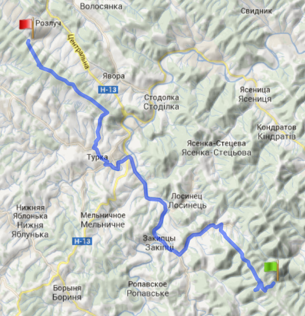 Славское (Украина) Орявчик - Турка – Грязево – Лопушница – Мостиска – Яворов – Коты – оз.Новое – Немиров – Зеленая Гута – Рава Русская  - Заставное  - Заболотье – Варяж – Угринов – Тудорковичи – Нововолынск – Устипуг – Корытница - Мосыр – Шацк  - оз. Песочное – Пища – (Белоруссия) оз . Олтужское – Ланское – Тересполь –   Брест – Камянец – Каменюки – Беловежская пуща – Пружаны – Барановичи – Несвиж – Мир - Радошковичи -  Минск