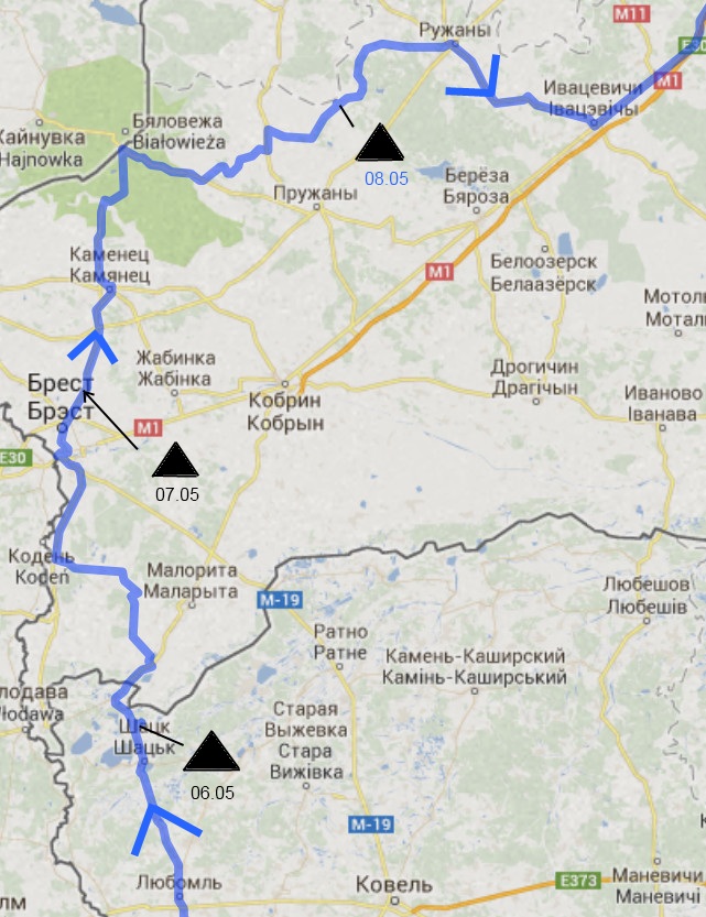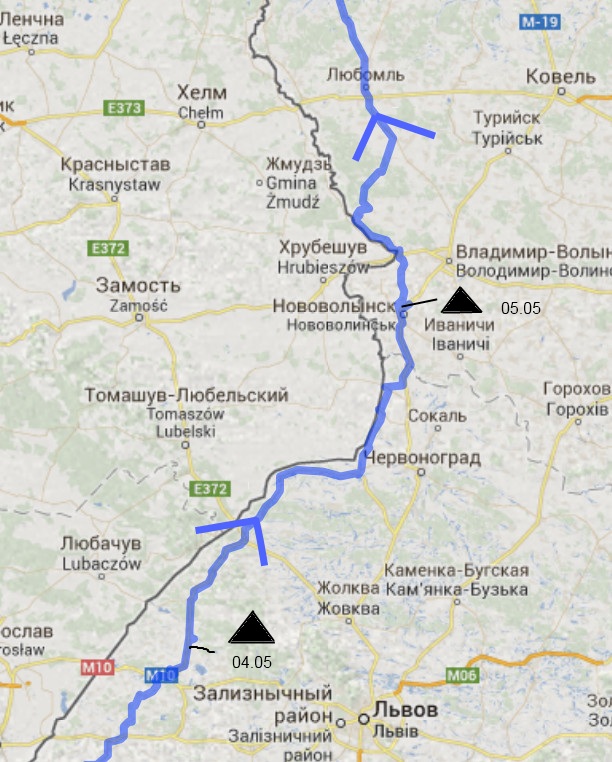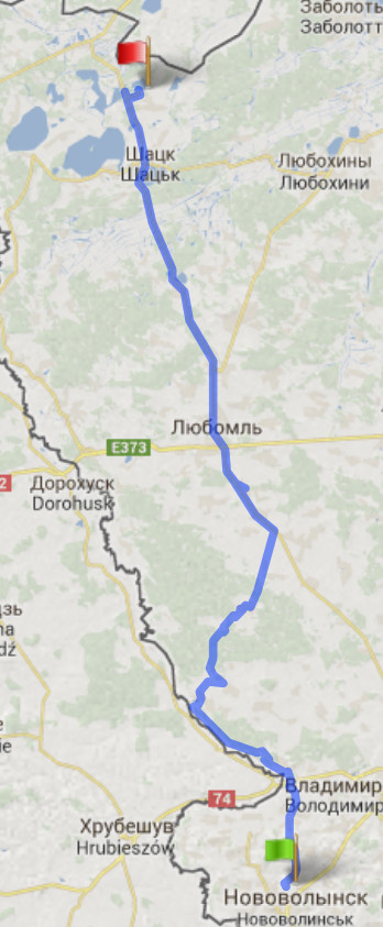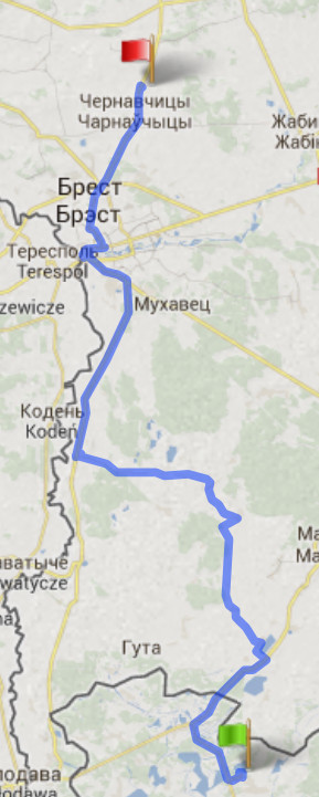 вместо следования по маршруту Корытница - Кладнов - Терехи - Шацкие озера, группа прошла по маршруту Корытница - Мосыр, выезд на трассу - Шацкие озера. Изменение вызвано прямым требованием пограничного наряда, с контролем его выполнения. Аргументация пограничника - отсутствие каках-либо дорог на лесном участке Кладнов - Терехи